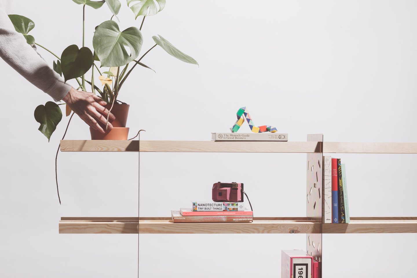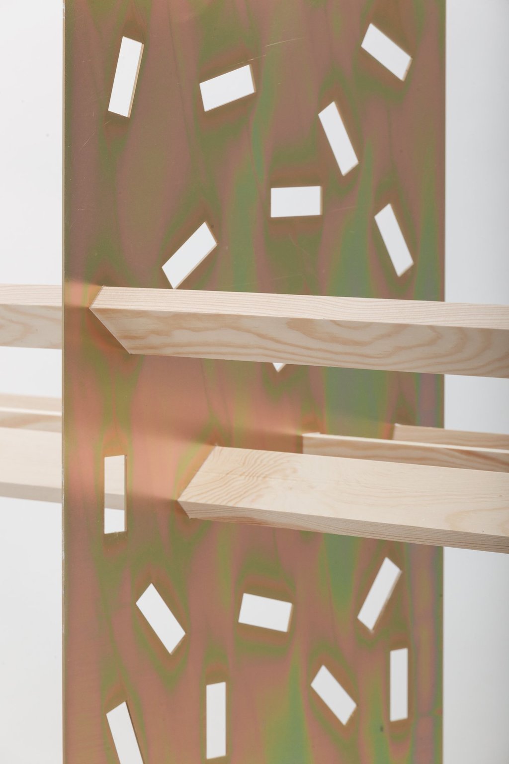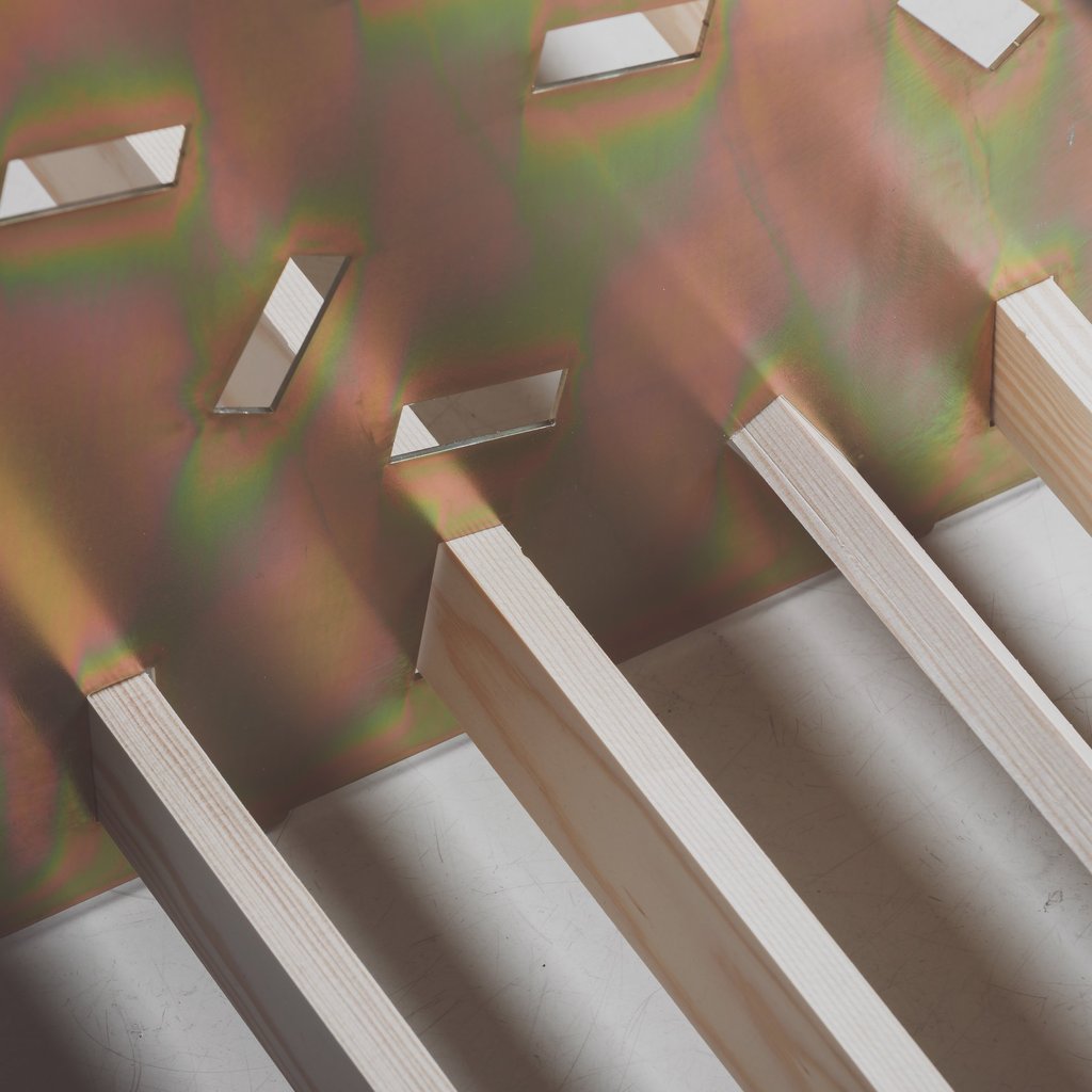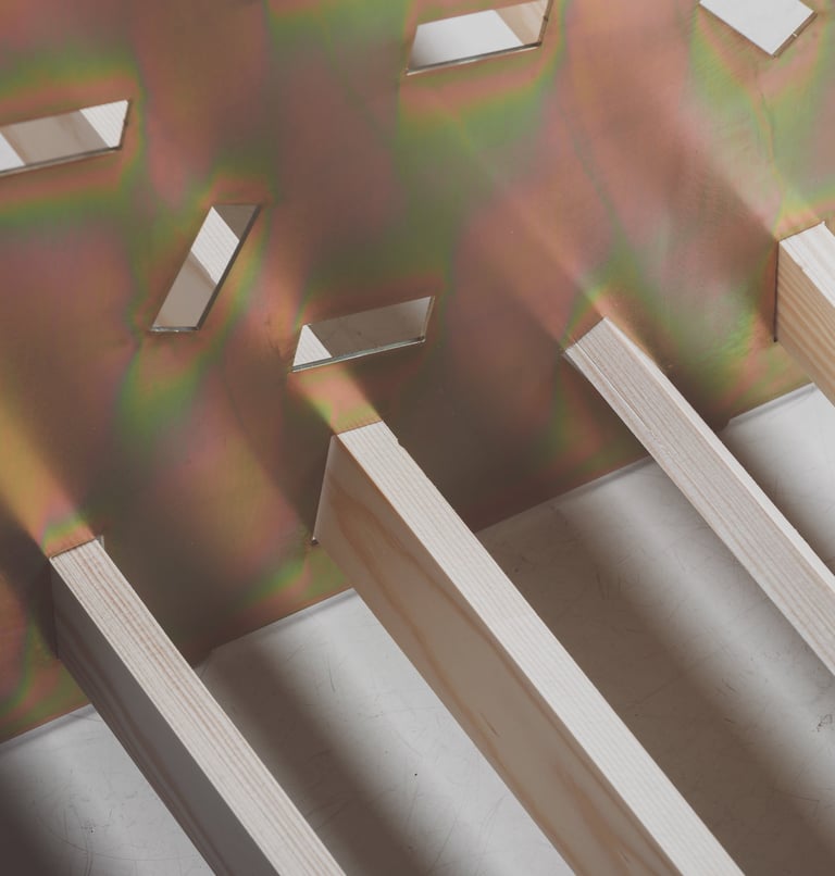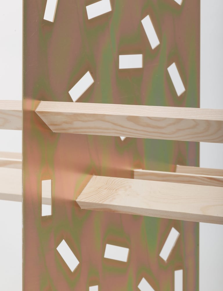 The shimmering metal surfaces subtly shift color depending on the light and the viewer’s position, creating a dynamic contrast with the soft natural tone of the wood. Thanks to its modular logic and variable geometry, CONFETTI can adapt to different spaces and functions — from storing books to displaying plants or objects. Its refined simplicity invites a tactile and visual interaction, celebrating the balance between material honesty and playful elegance.