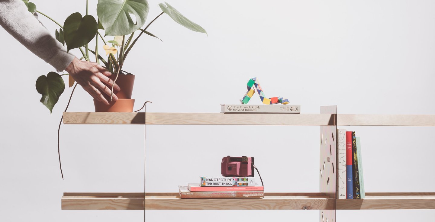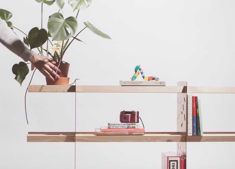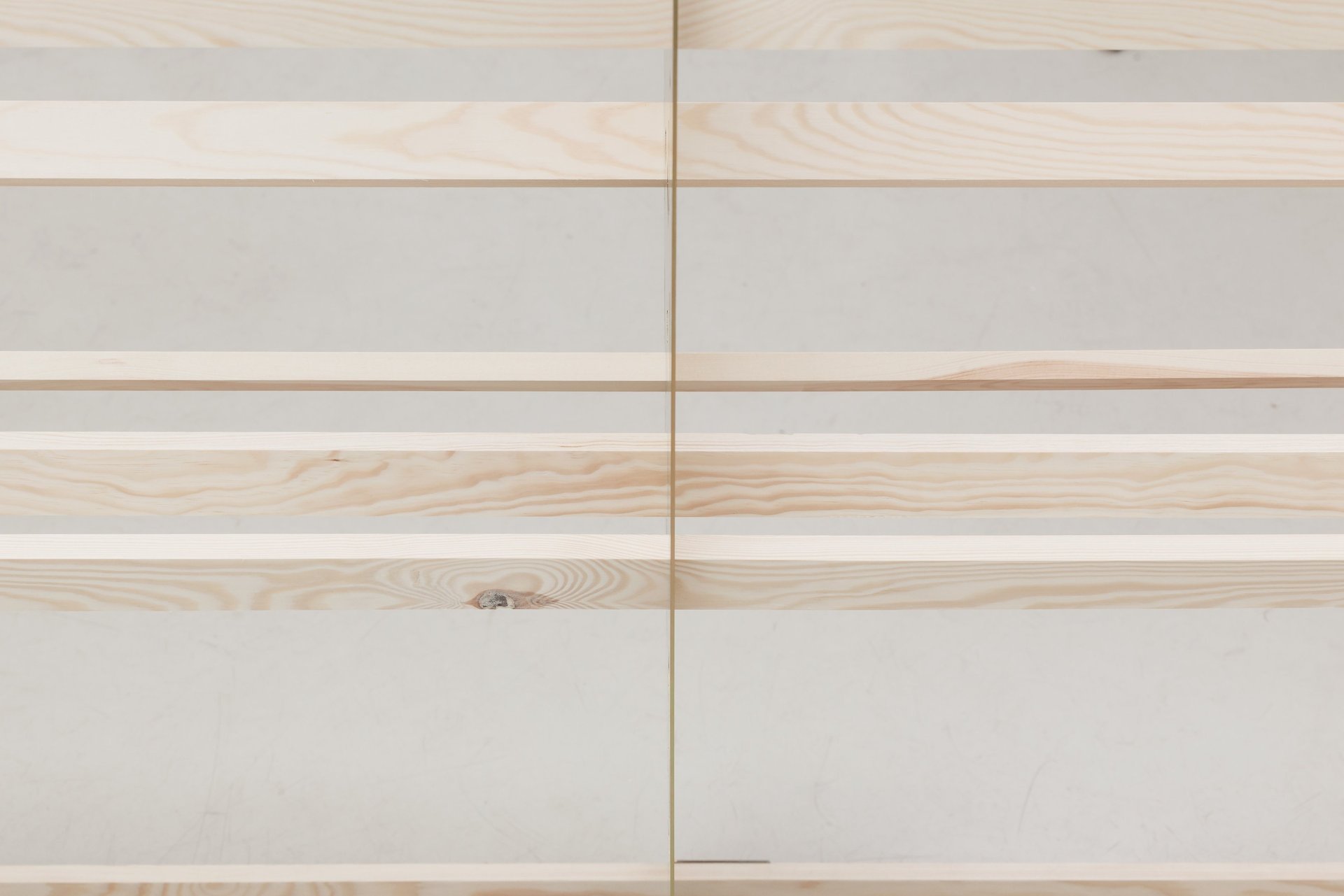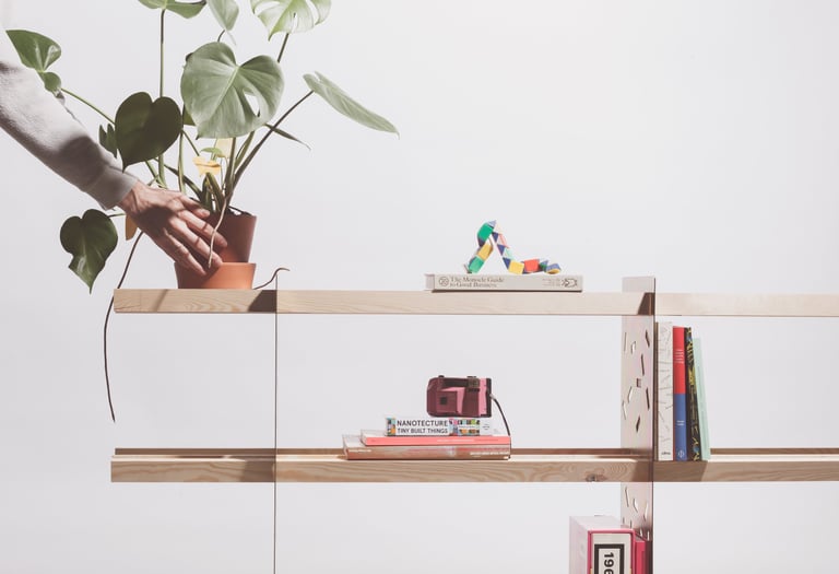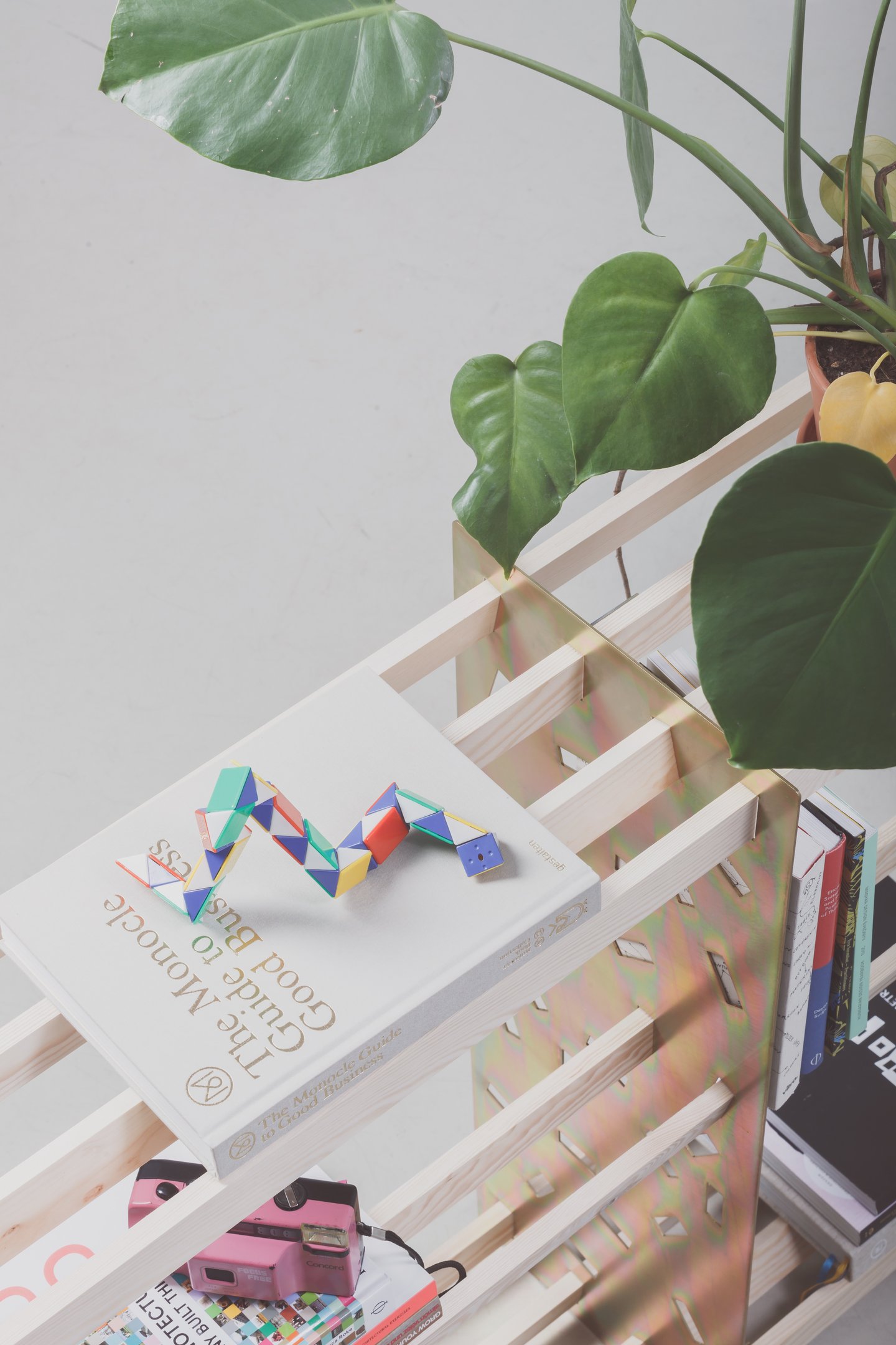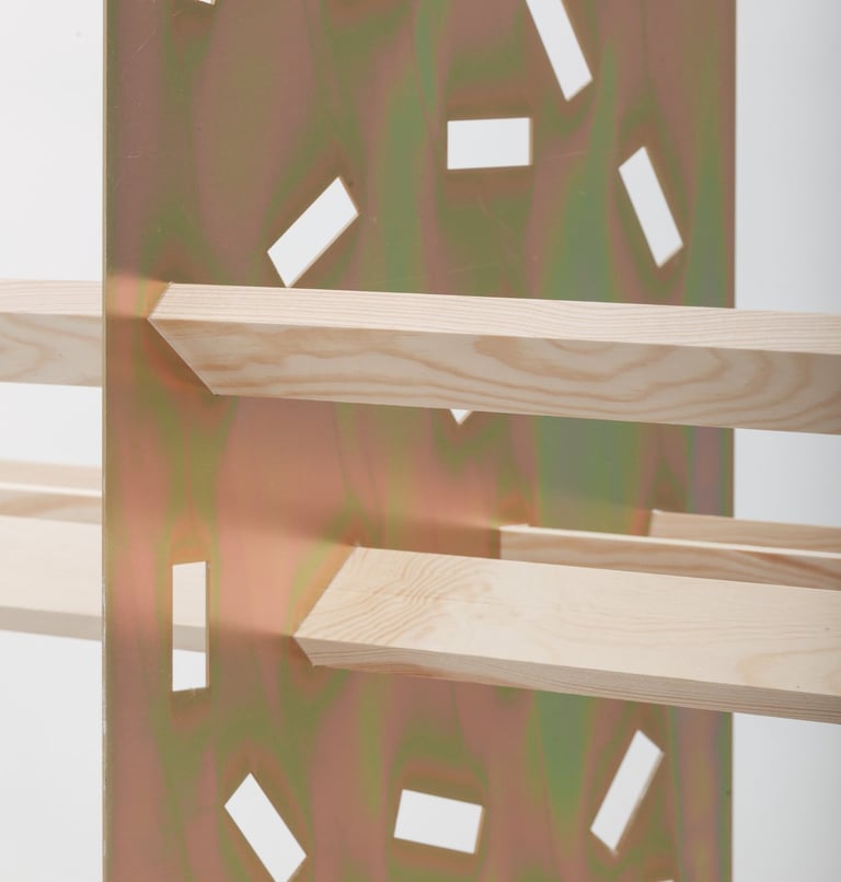 The shimmering metal surfaces subtly shift color depending on the light and the viewer’s position, creating a dynamic contrast with the soft natural tone of the wood. Thanks to its modular logic and variable geometry, CONFETTI can adapt to different spaces and functions — from storing books to displaying plants or objects. Its refined simplicity invites a tactile and visual interaction, celebrating the balance between material honesty and playful elegance.