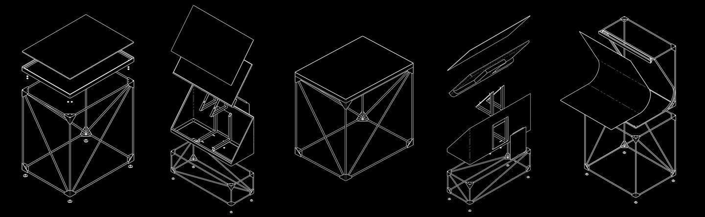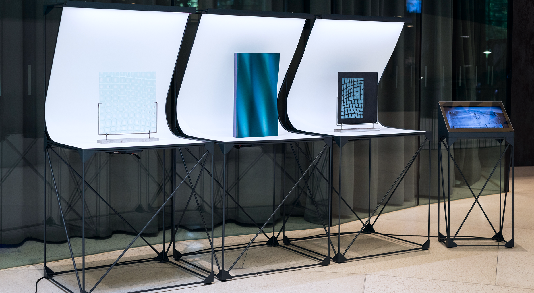 Showcasing glass artworks proved especially difficult: their reflective surfaces picked up glare from lighting and surrounding objects, making them harder to view and nearly impossible to photograph without environmental distractions. We needed an installation system that not only addressed this issue but could be quickly assembled, easily transported, and adapted to a variety of exhibition spaces.