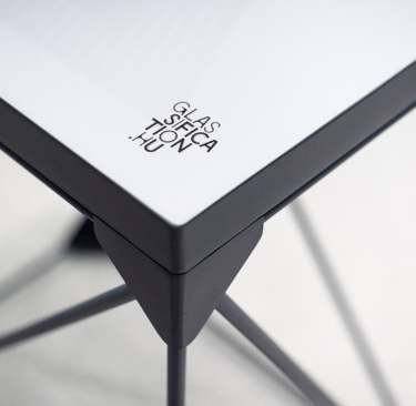 The installation is constructed from a modular system of steel rods, designed to take up very little space when disassembled. This makes it easy to pack, store, and transport between venues. Once assembled, the rods form a robust, stable frame that is strong enough to safely support the fragile glass artworks while maintaining a visually light and minimal presence in the exhibition space.