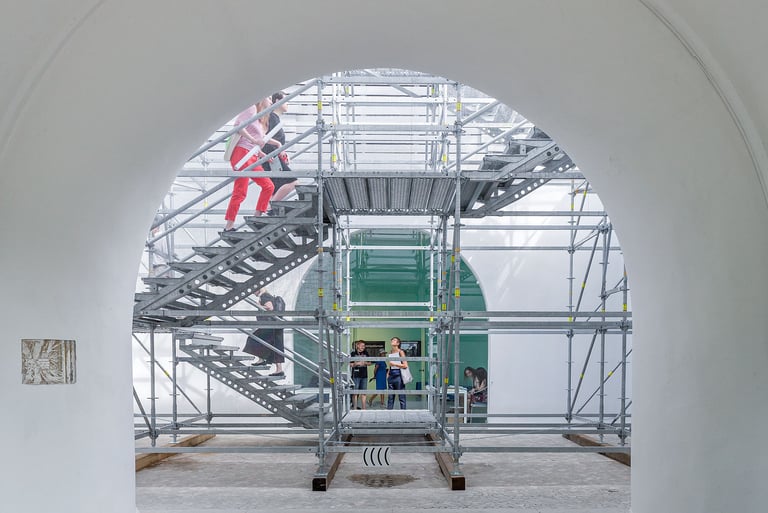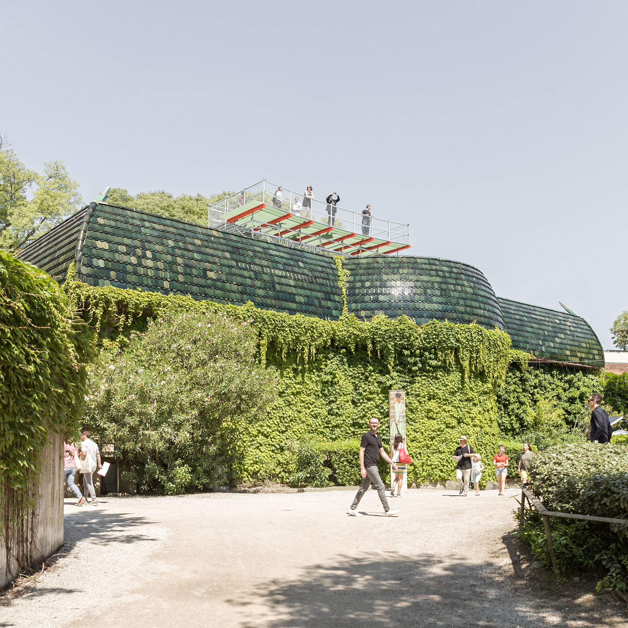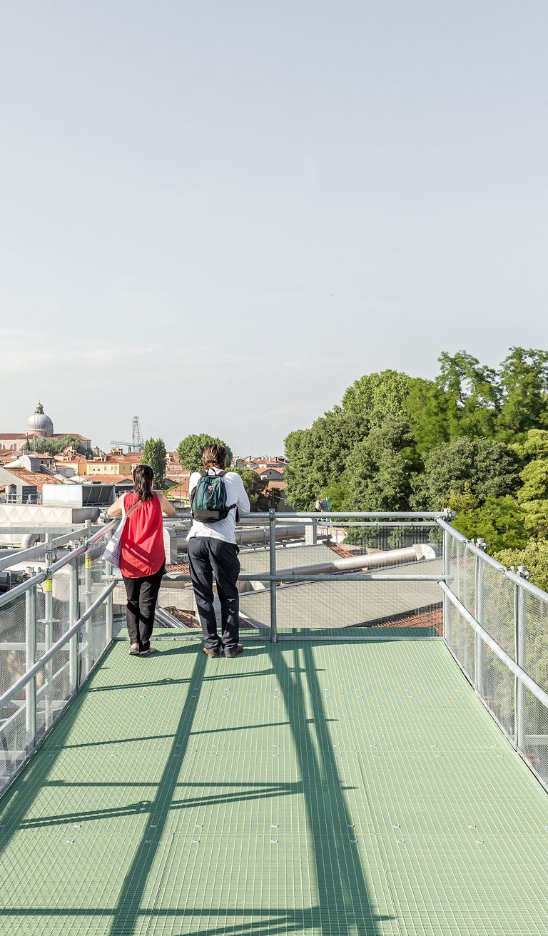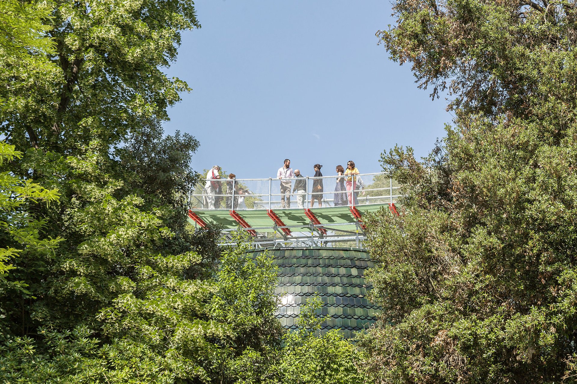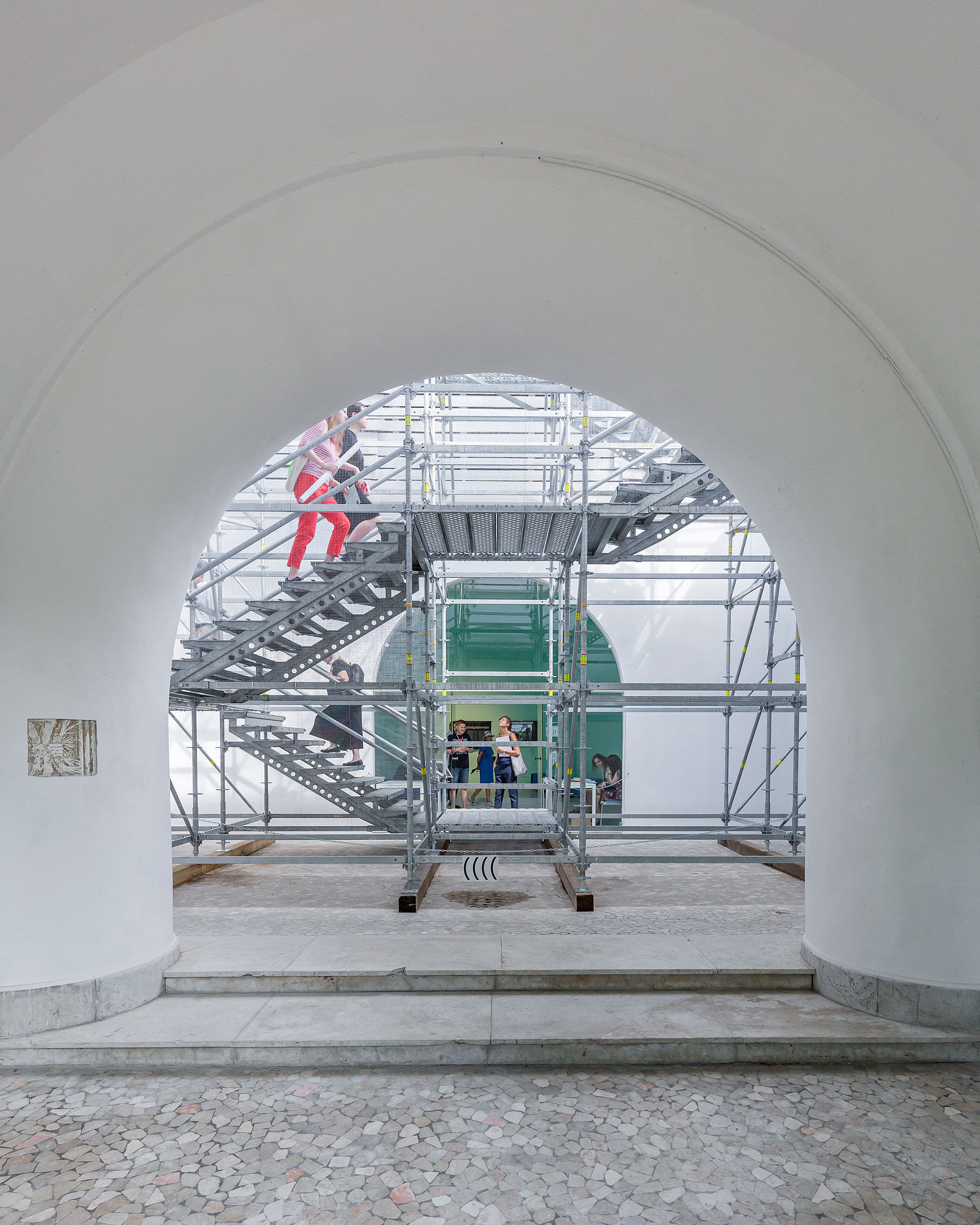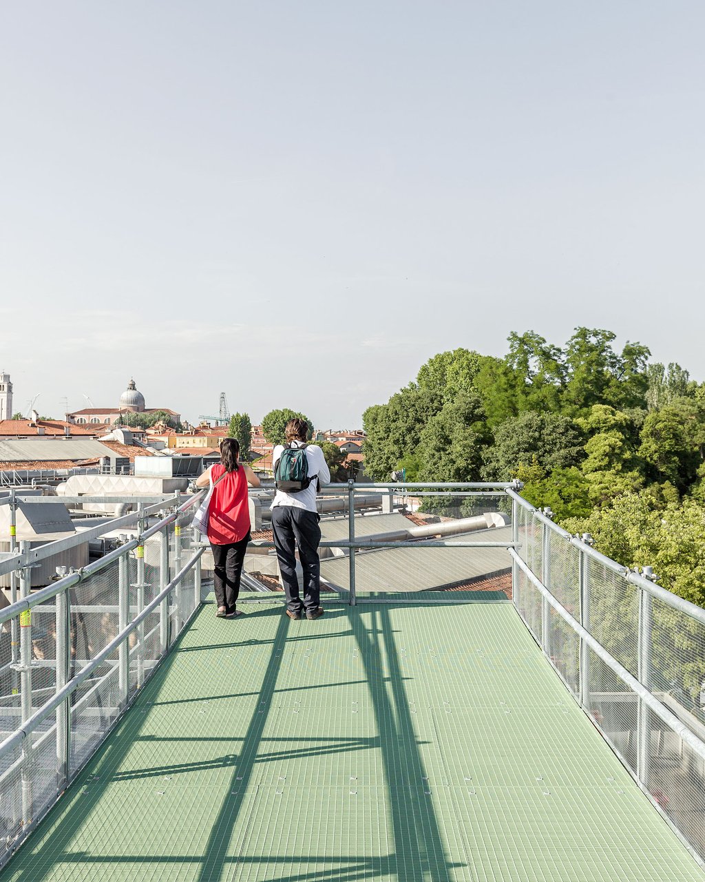 The lookout tower built in the atrium of the building allows us to experience the events of Liberty Bridge. The 10-meter-high installation is embedded in the space, leading the visitors above the building, giving a completely new perspective to the Giardini's garden and surrounding national pavilions from among the treetops.