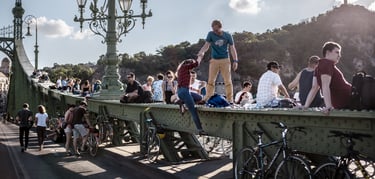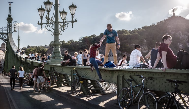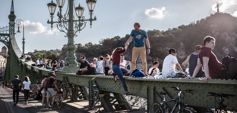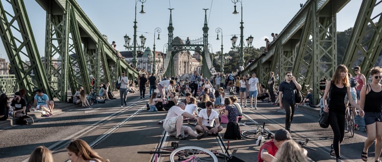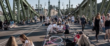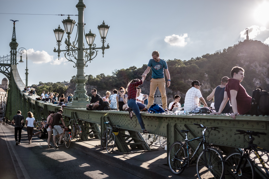 In 2016, one of the oldest Danube-bridges of Budapest, the Liberty Bridge became car-free due to an infrastructural development in the neighborhood. Citizens, mostly millennials immediately put the road and tram tracks to creative use, and re-imagined the historic place. The construction turned into street furniture, hosting picnics, grill-parties, yoga classes.