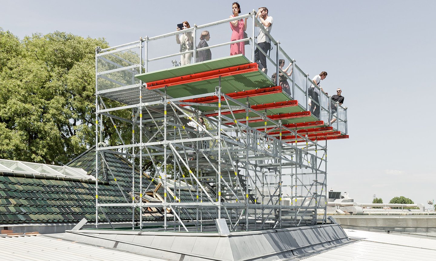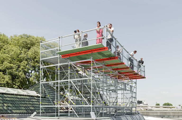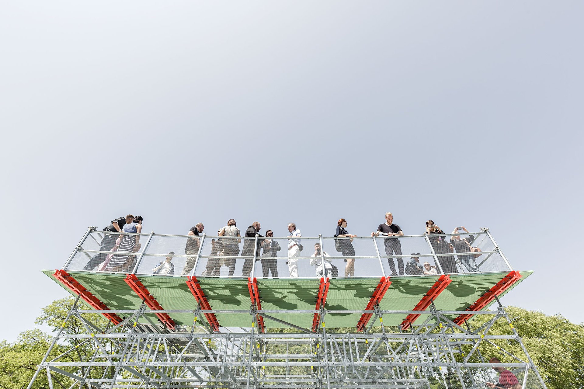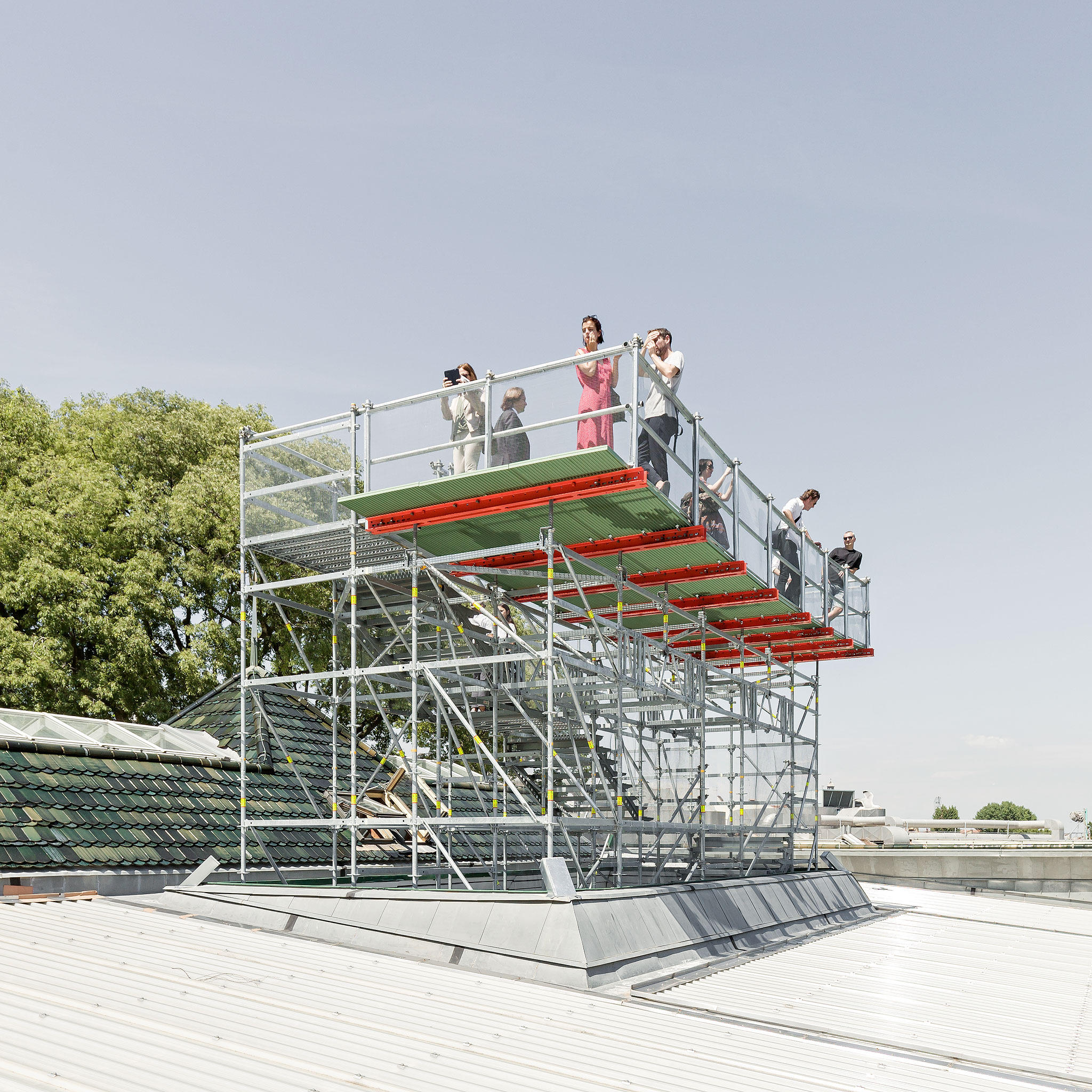 The lookout creates an unprecedented situation in the pavilion's original spatial system. Its presence is natural with its casual appearance; its use is self-evident to visitors. The installation makes it possible to experience the feeling what the free use of public space means for people living in the city.