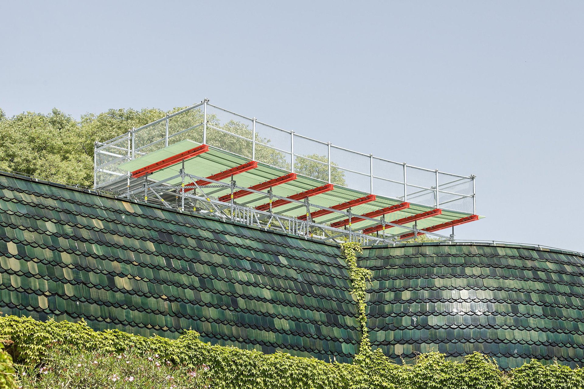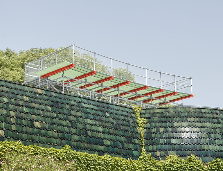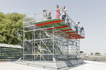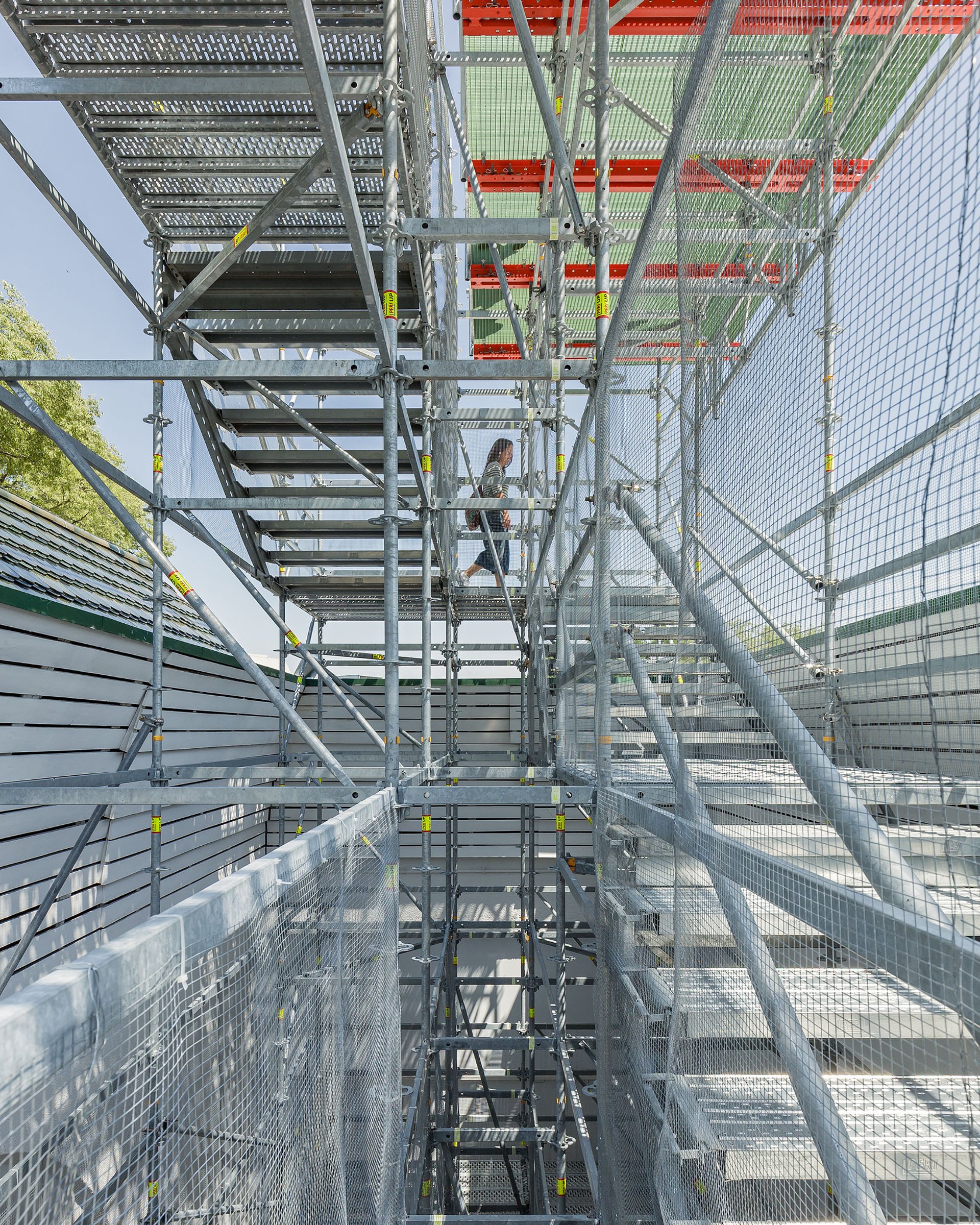 The lookout creates an unprecedented situation in the pavilion's original spatial system. Its presence is natural with its casual appearance; its use is self-evident to visitors. The installation makes it possible to experience the feeling what the free use of public space means for people living in the city.