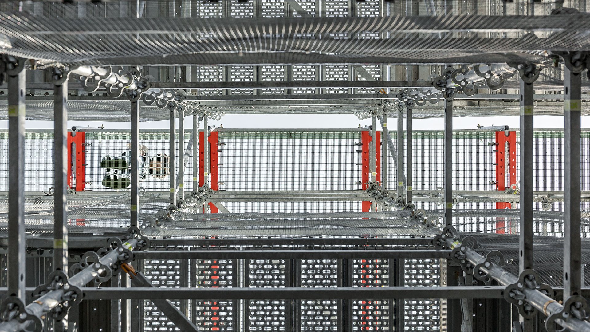 The structure is simple metal scaffolding that connects to the building only on the ground floor. Its appearance and design suggest temporaryity, referring to the occasional transformation of the bridge into a public square.