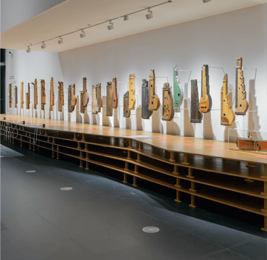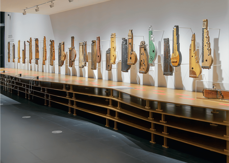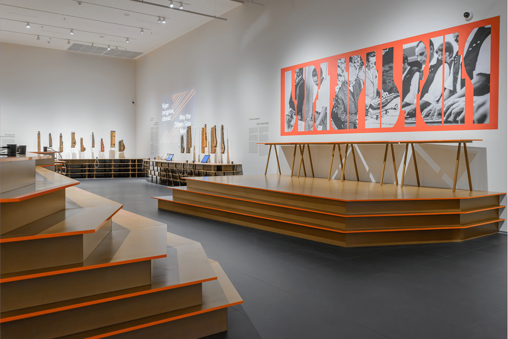 At the heart of the exhibition is a stage that functions both as a concert venue and a social gathering point. It transforms the museum into a communal space, hosting live zither performances and allowing audiences to experience the music first-hand.