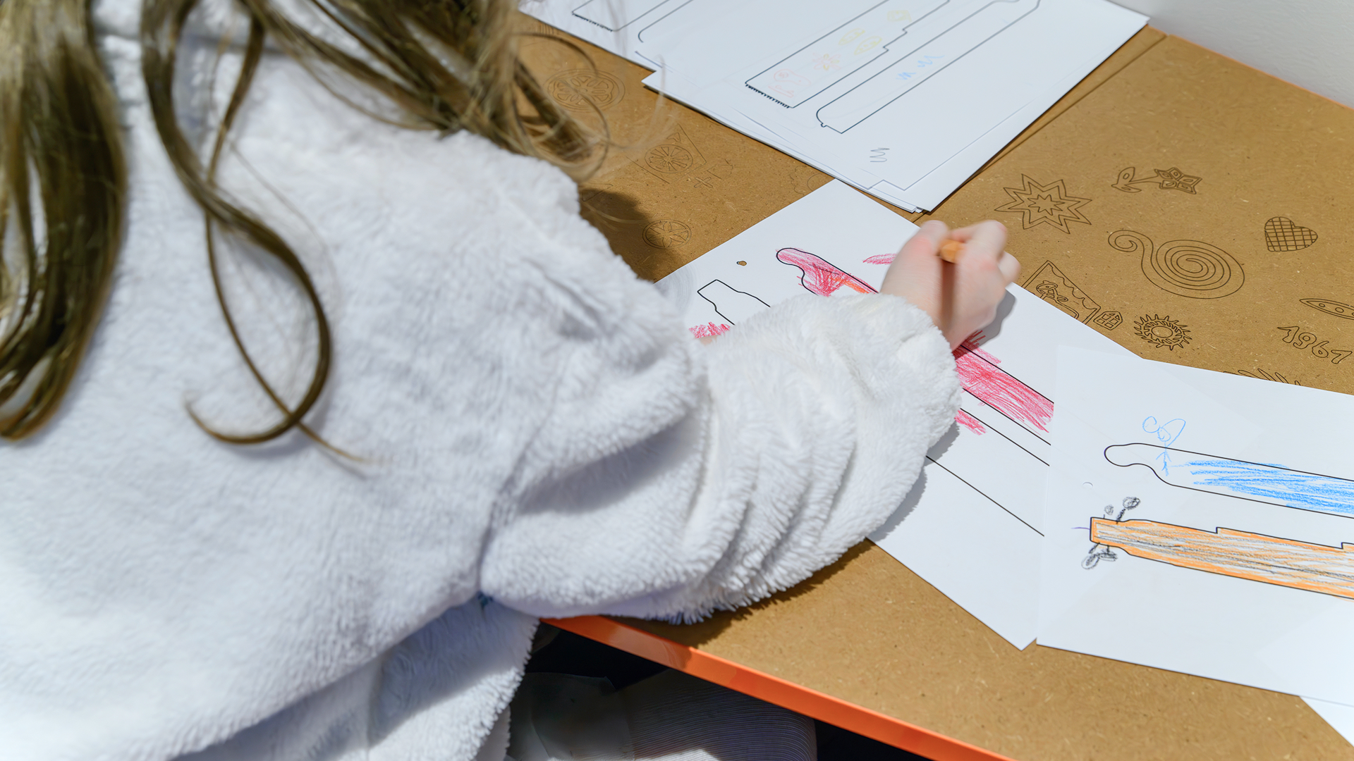 Designed primarily for younger generations, part of the space invites visitors to trace stencil-like patterns found on real zithers using coloured pencils, reflecting the way zithers are often personalised. Later, children can search for these shapes in the objects and even create their own zither decoration.