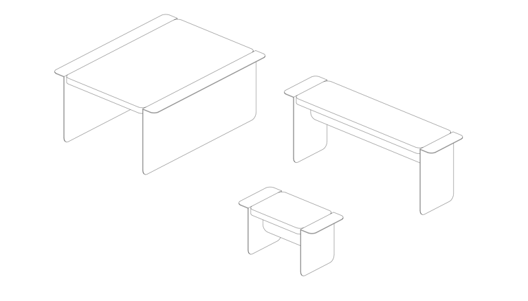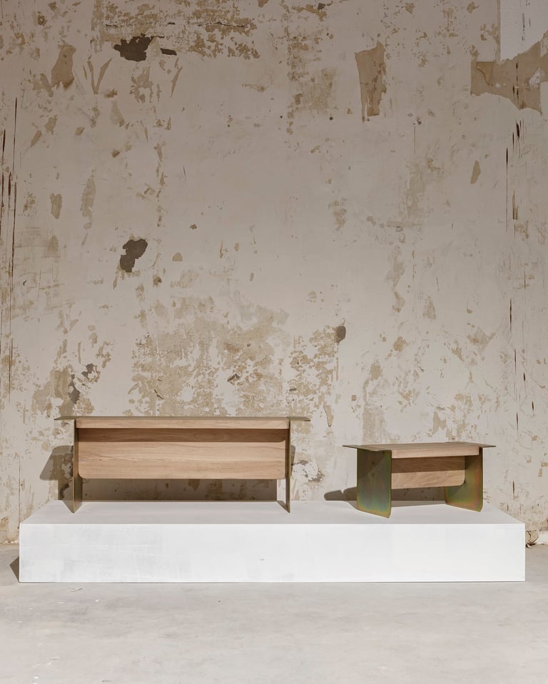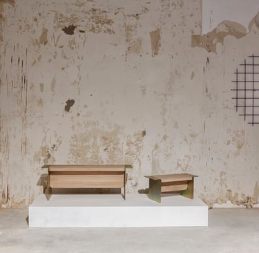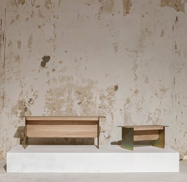 The Midas collection explores the dialogue between industry and craft. Combining yellow zinc–plated steel with solid wood, each piece balances raw precision and natural warmth. The minimal geometric forms draw inspiration from Japanese structural clarity and the symbolism of ancient Greek mythology. Through this fusion, Midas reflects on transformation — where industrial surfaces meet timeless materiality.