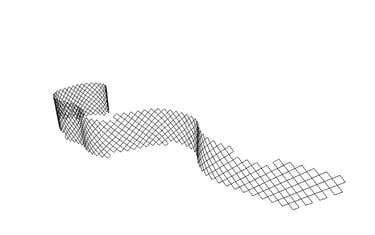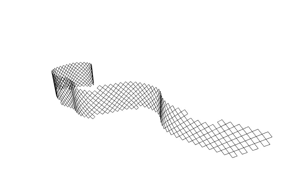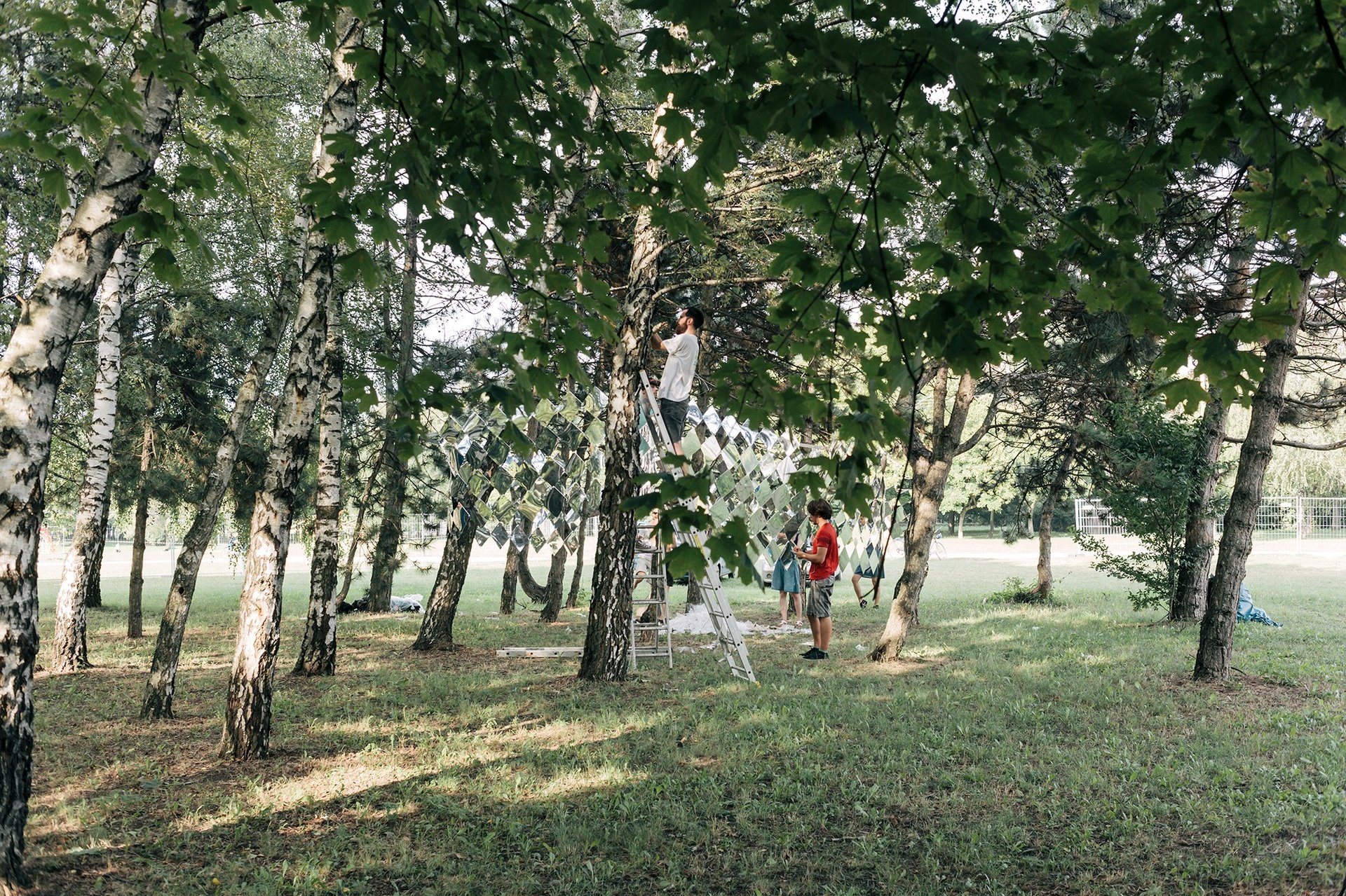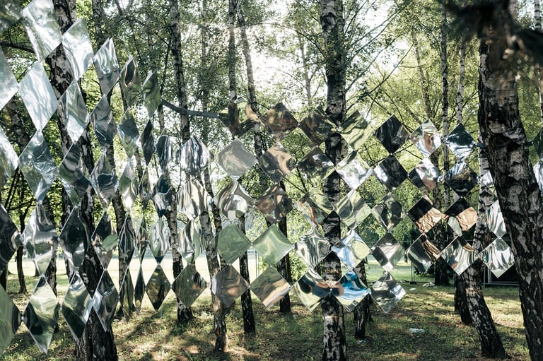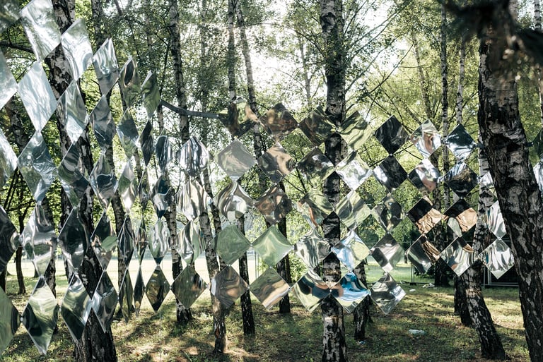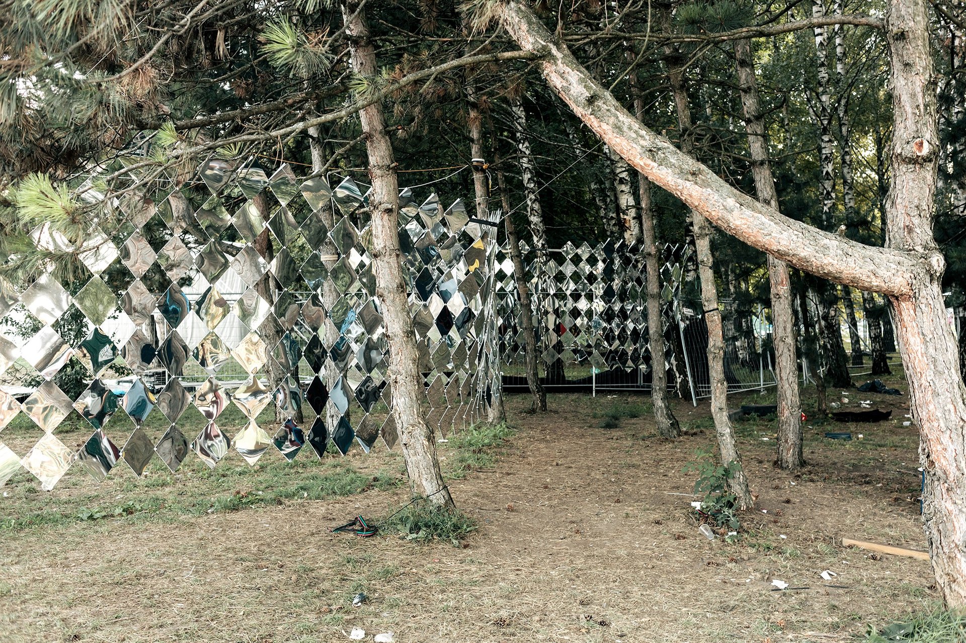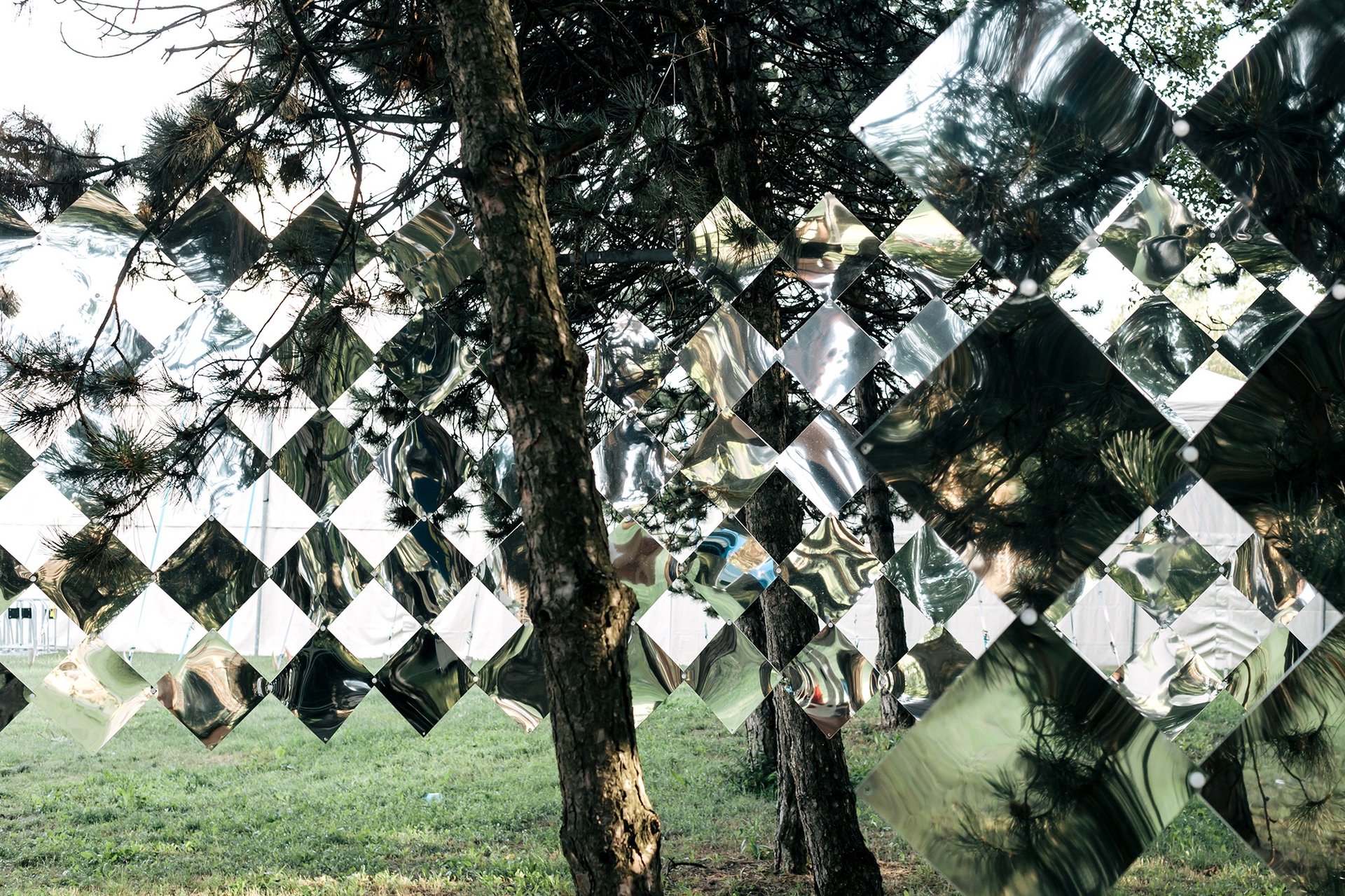 MIRAGE PAVILION is a temporary installation made for Sziget Festival in 2014. We were inspired by the camouflage pattern of the WW II. battleships. We used more than 1200 reflective plastic sheets in strict rectangular pattern to create a 25m long mazy wall among the trees.
