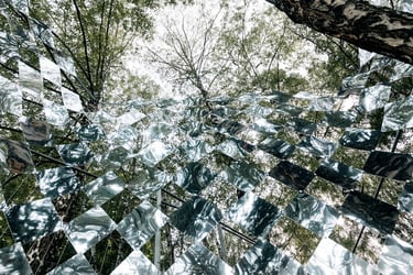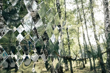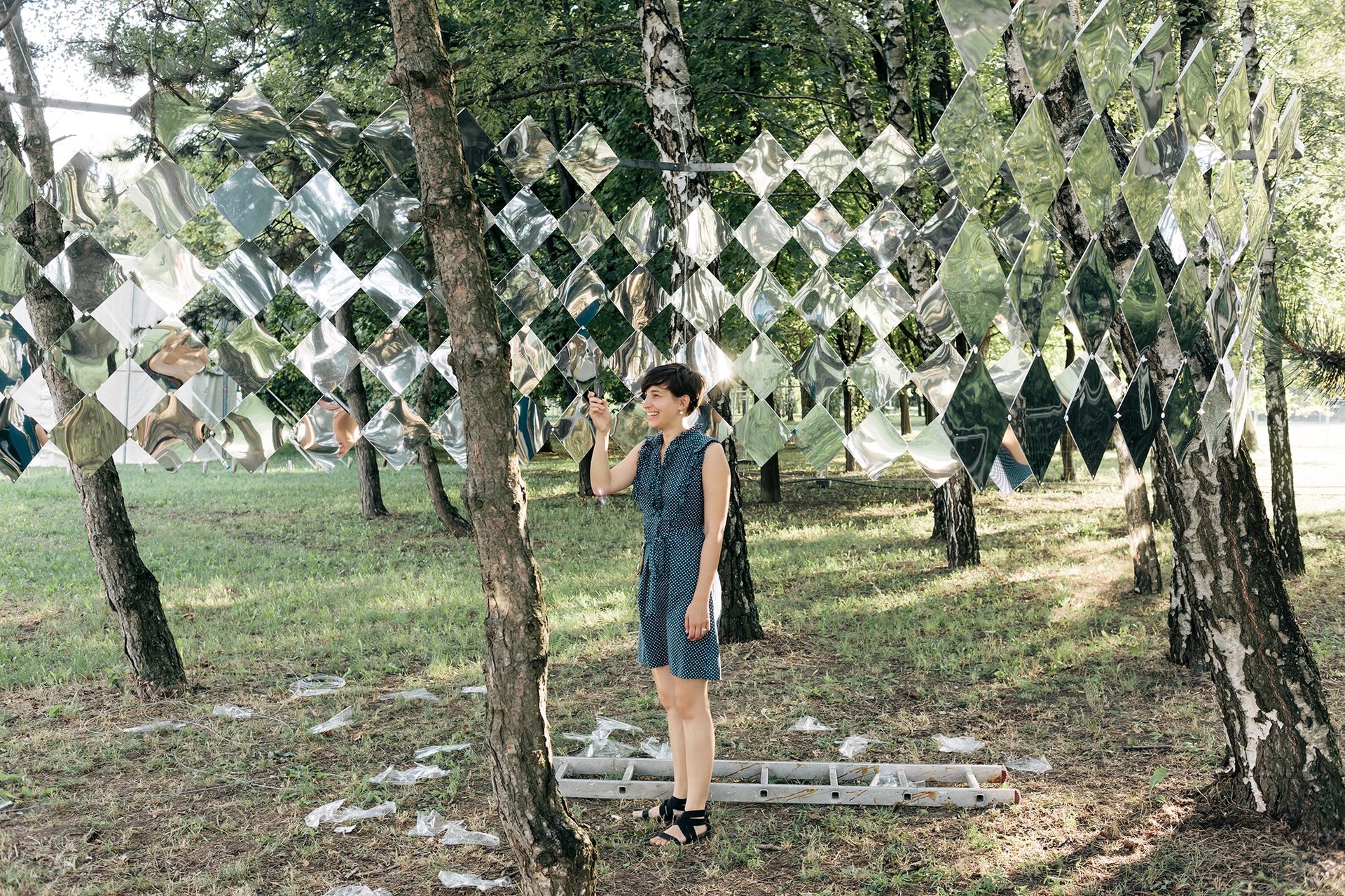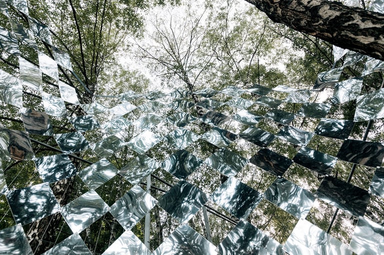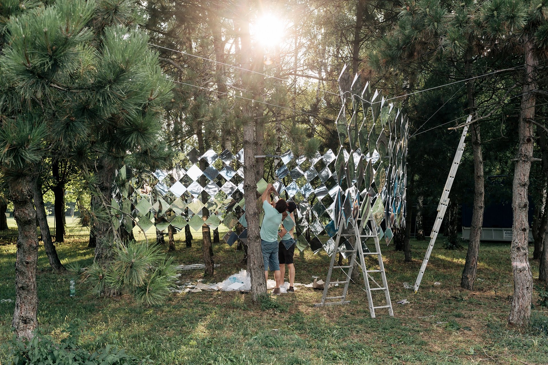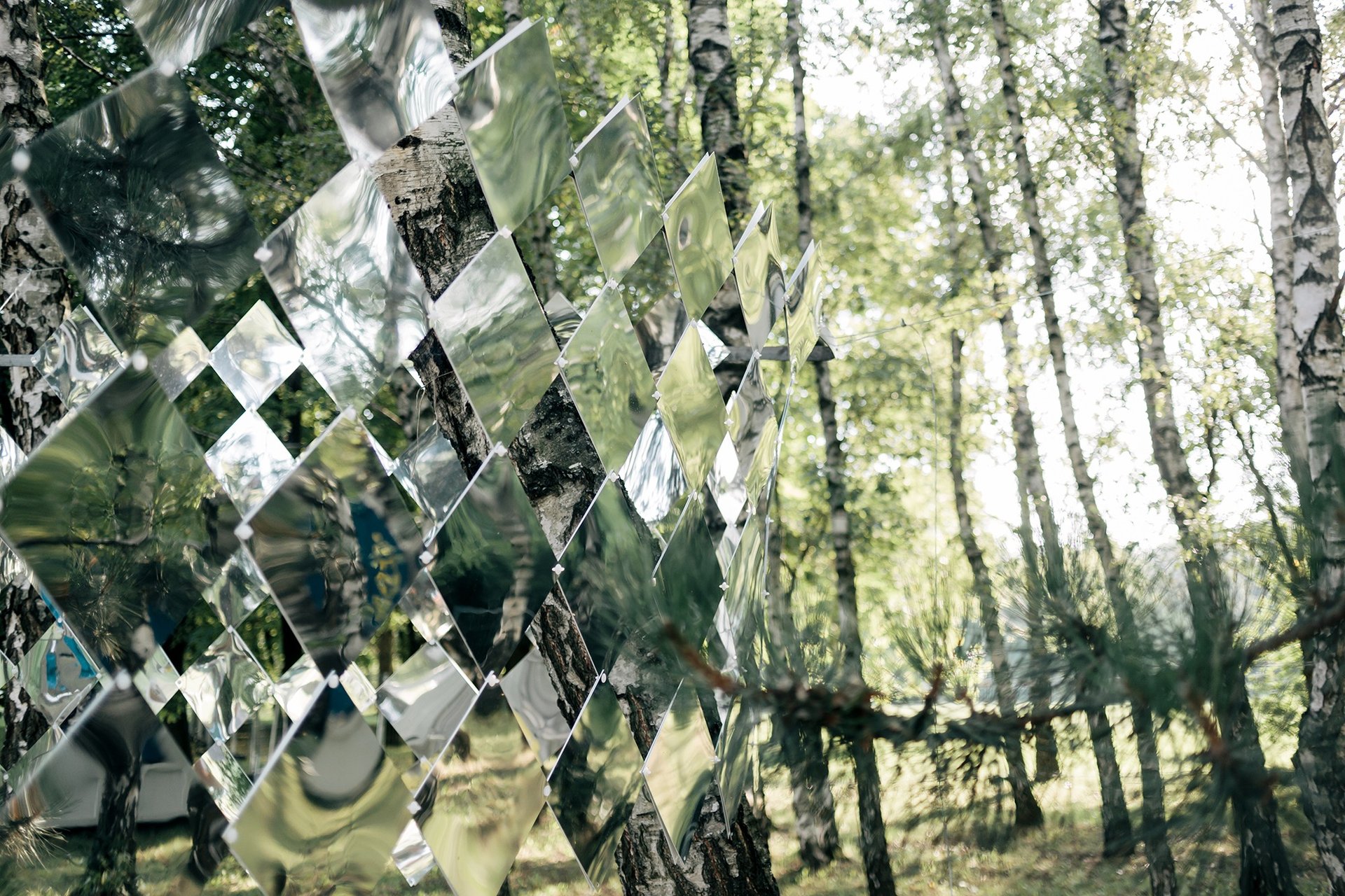 Arranging pieces of diamond-shaped mirror in a strict pattern, the team created a chequered band that reflected fragments of the surrounding forest.
